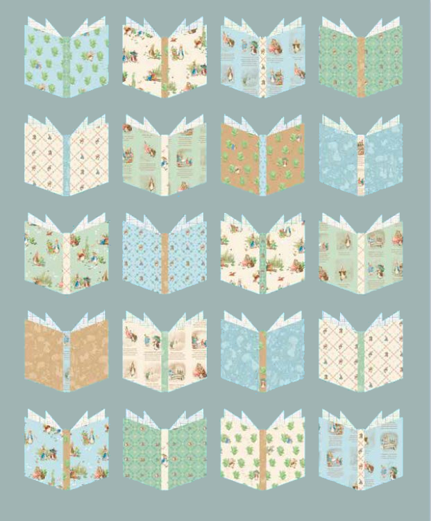 The Peter Rabbit and Benjamin Bunny collection features Beatrix Potter's iconic illustrations — soft creams, storybook panels with classic text and garden scenes, gentle florals, and delicate lattice prints. The solid background fabric gives the open-book blocks room to shine and ties the whole quilt together beautifully.
